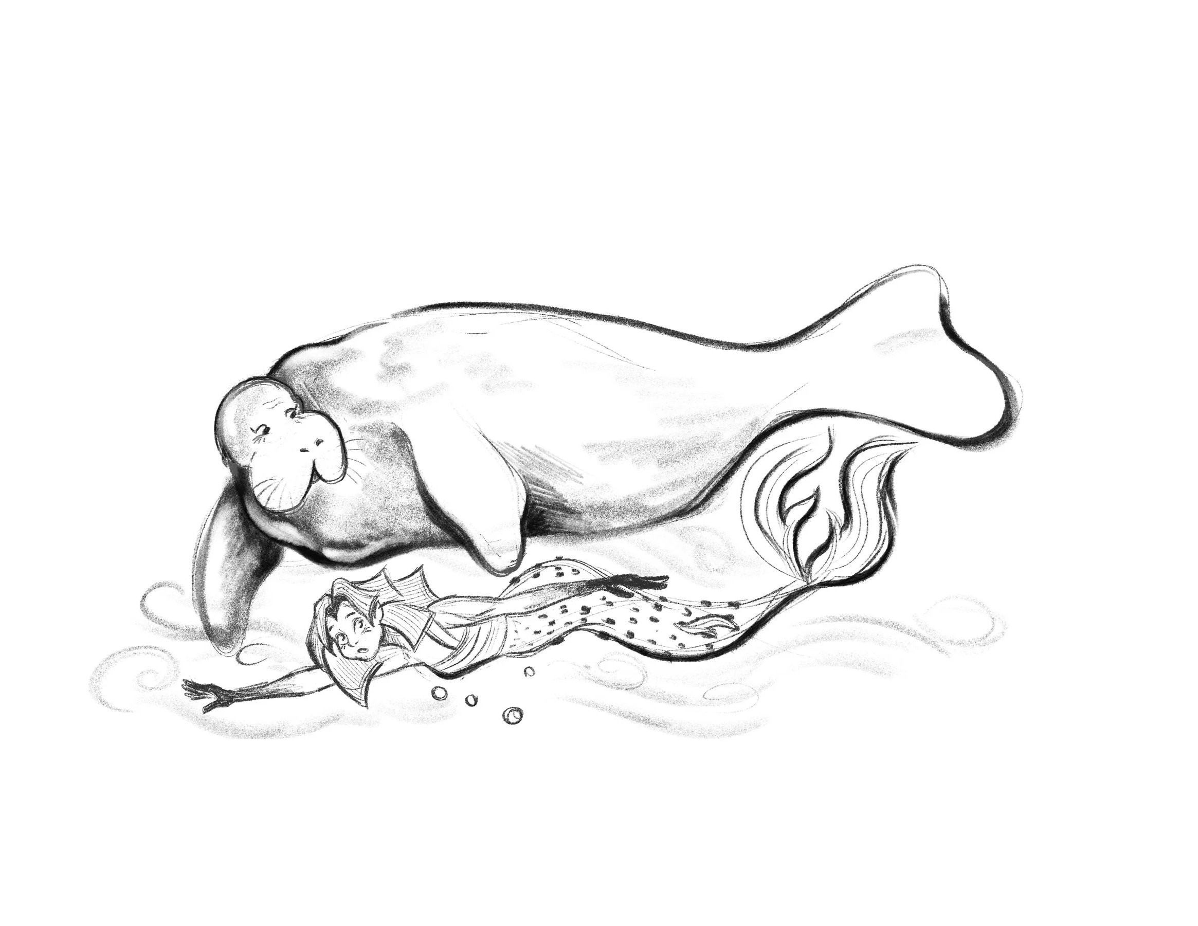 This process began with rough thumbnails for each spread, using a continuous, wavy line to guide the pacing and create a fluid, underwater reading experience. From there, the structure of the book was reworked by expanding key moments, especially the opening and ending into full spreads, allowing for stronger world-building and greater emotional impact. After finalizing the layouts, Cheecha moved forward by selecting key spreads to develop into full-color illustrations.